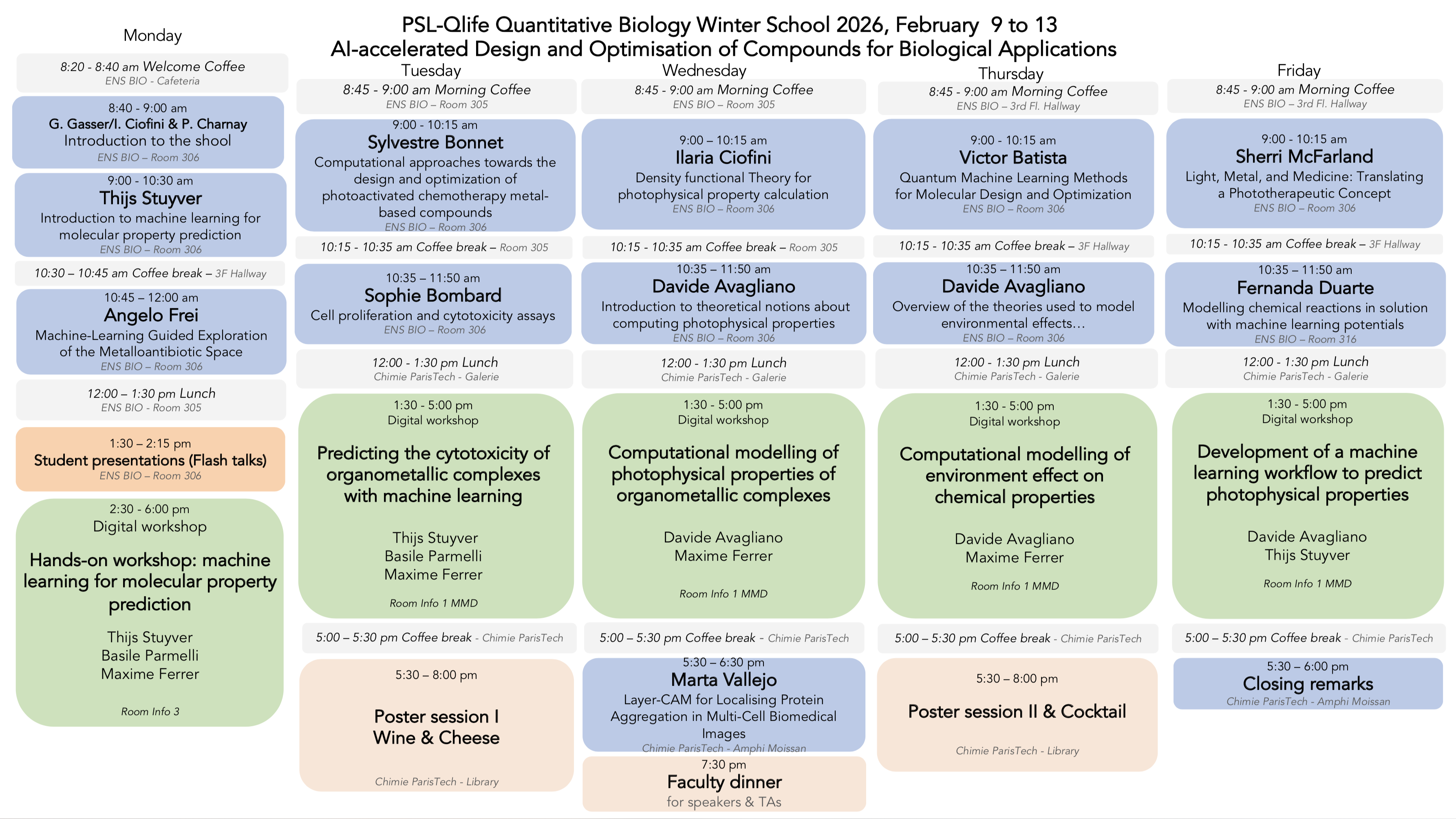 Aims and themes : Recent technological developments in artificial intelligence (AI), machine learning and computational approaches have enabled in-silico design of compounds for medicinal and biological purposes with unprecedented speed and precision. The Qlife program in Quantitative Biology of the PSL University organizes a 5-day Winter School that will cover these cutting-edge approaches through a series of introductory lectures in the mornings, followed by digital workshops in the afternoons. Evenings will feature keynote speaker seminars and poster presentations by the students. The aim of this Winter School is to provide the attendees with a basic set of skills in different areas, including AI, TD-DFT, medicinal chemistry, photochemistry and chemical biology, with a clear emphasis on practical examples and guidance from experts in the field.